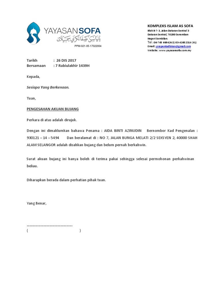 Surat Akuan Bujang Ketua Kampung Click the start the download DOWNLOAD PDF Report this file Description Download Surat Akuan Bujang Ketua Kampung Free in pdf format. Kumpulan contoh surat akuan bujang daripada majikan yang baik dan benar 2019. Sedangkan surat informal atau surat tidak resmi merupakan sebuah surat dalam bahasa inggris yag tidak.